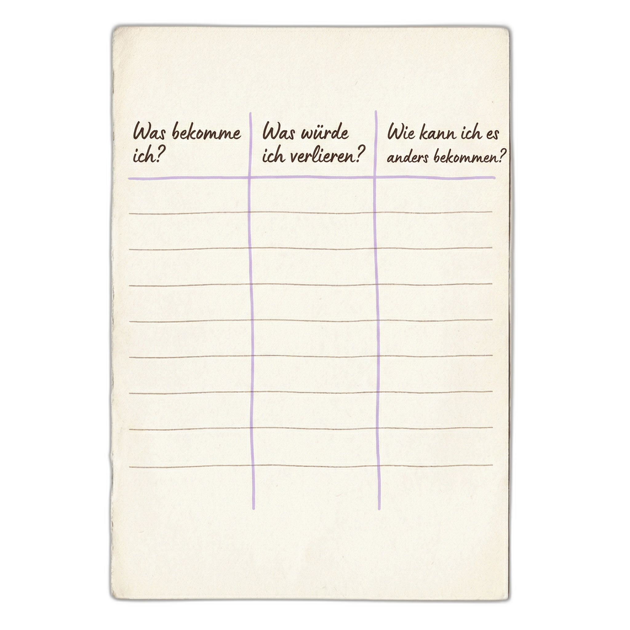 Praktische Übung – Drei-Spalten-Reflexion: Nimm dir ein Blatt Papier und erstelle drei Spalten: „Was bekomme ich?“, „Was könnte ich verlieren?“ und „Wie kann ich es auch anders bekommen?“. Sei ehrlich zu dir – niemand sonst sieht das. Wenn du erkennst, welches Bedürfnis erfüllt wird, kannst du es auf gesundem Weg stillen.
