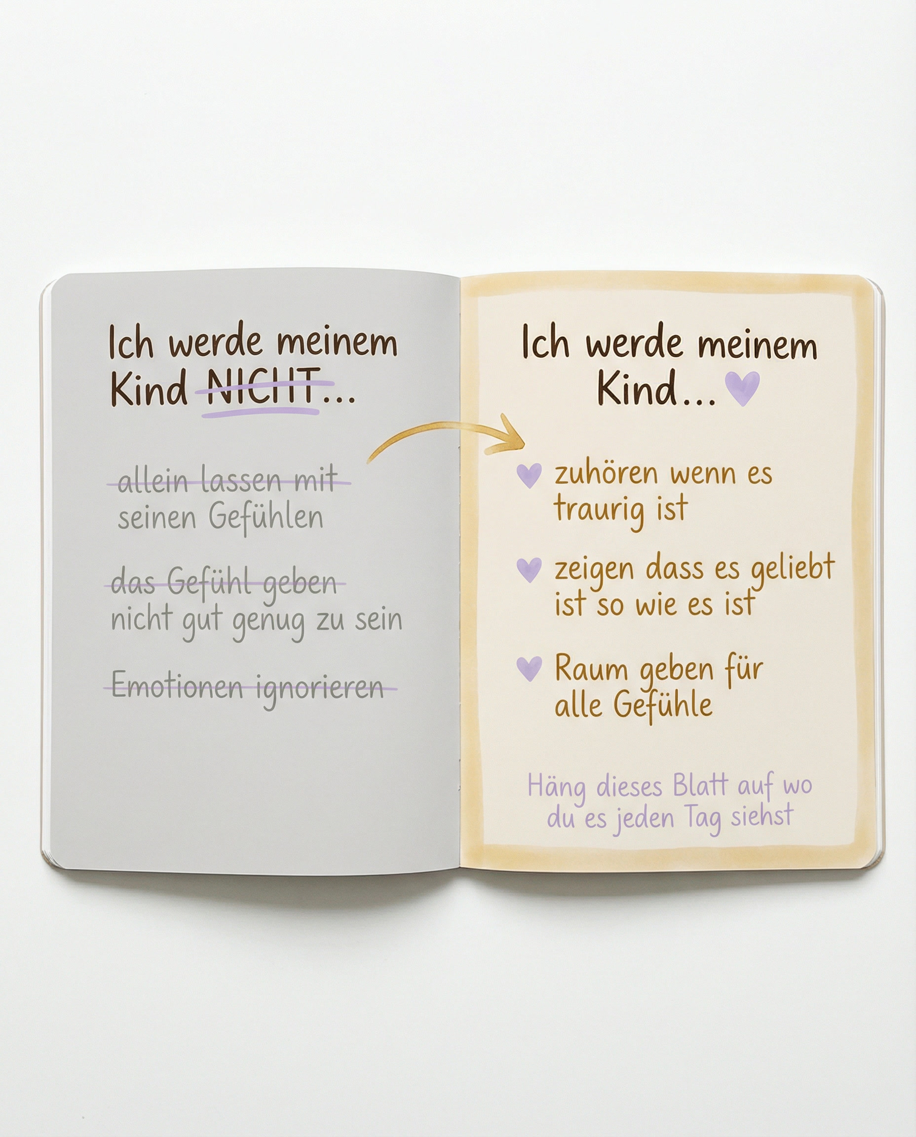 Praktische Übung – NICHT/WERDE-Blätter: Nimm zwei Blätter. Auf das erste schreibst du: „Ich werde meinem Kind NICHT …“ – und listest alles auf, was dir einfällt. Auf das zweite schreibst du: „Ich werde meinem Kind …“ – mit allem, wie du es besser machen willst. Häng das zweite Blatt auf, wo du es täglich siehst.