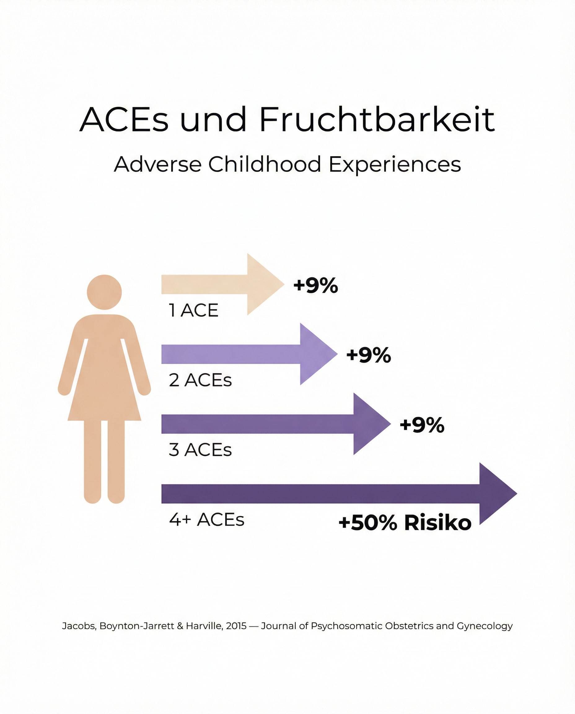 Eine Studie der Tulane University zeigte, dass jede belastende Kindheitserfahrung das Risiko für Fruchtbarkeitsprobleme um 9 % erhöhen kann. Frauen mit vier oder mehr solcher Erfahrungen hatten ein über 2,7-fach erhöhtes Risiko (Jacobs et al., 2015 – PubMed).