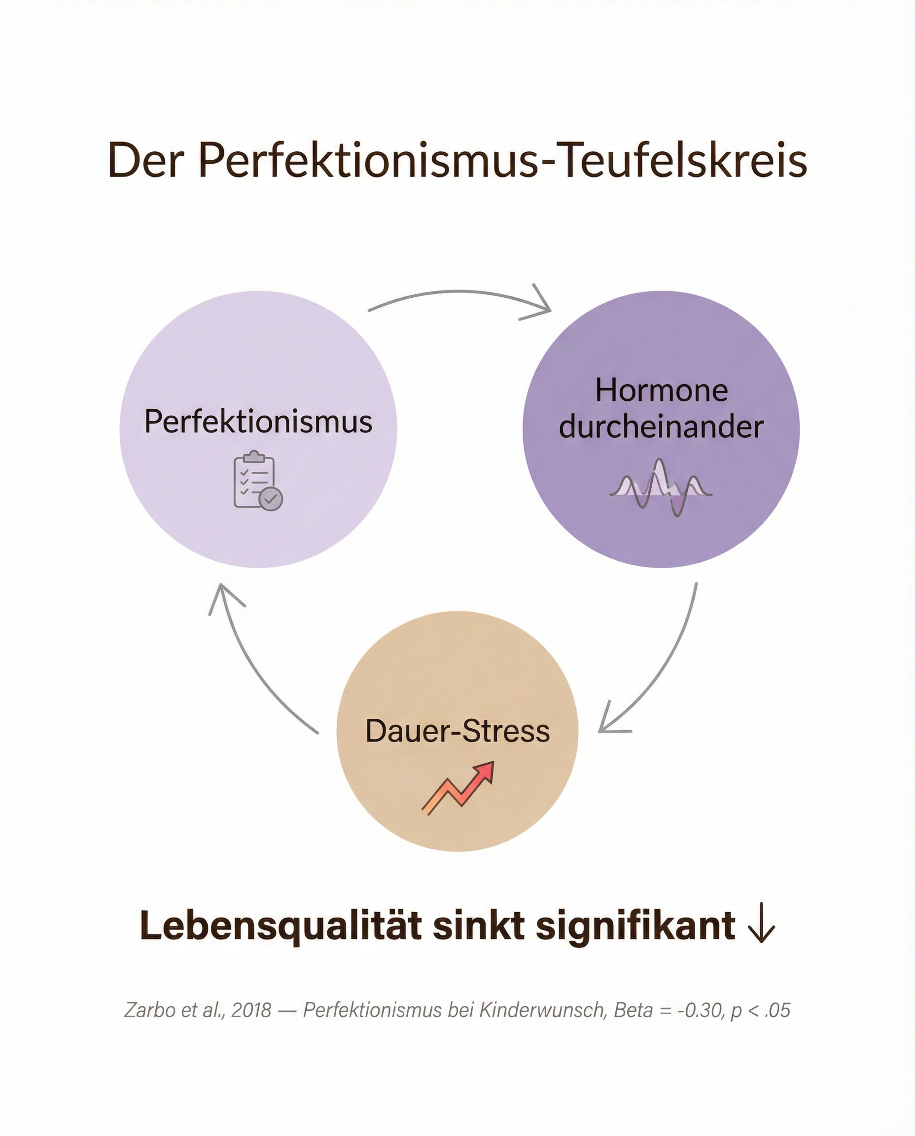 Forschungsergebnisse zeigen, dass Perfektionismus die Lebensqualität bei Frauen mit Babywunsch signifikant senken kann (Zarbo et al., 2018). Der Grund: Perfektionismus erzeugt Dauerstress, und das Nervensystem unterscheidet nicht zwischen „Ich muss perfekt sein“ und „Ich bin in Gefahr“.