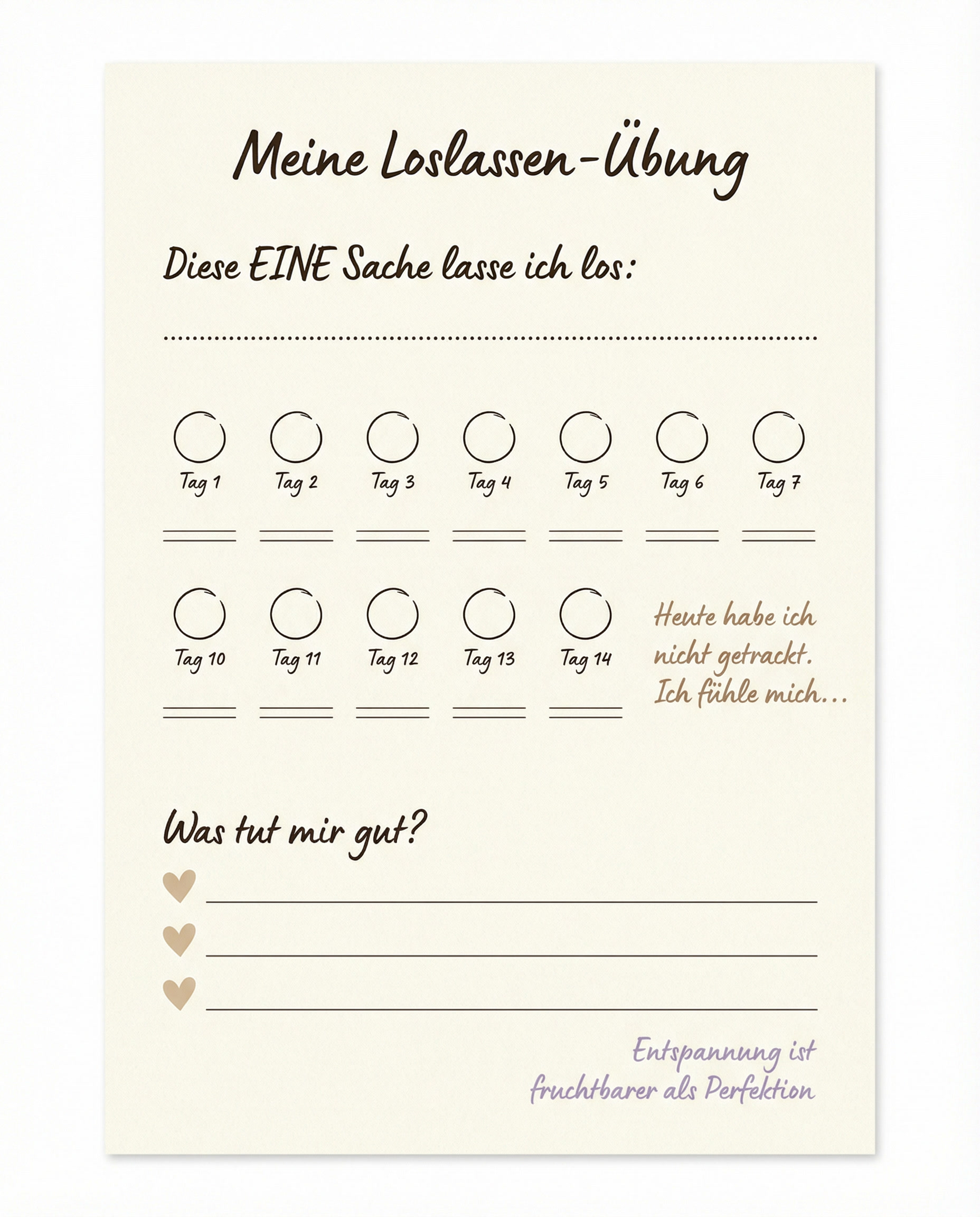 Praktische Übung – Loslassen-Journal: Wähle EINE Sache, bei der du bewusst loslässt. Vielleicht trackst du einen Tag nicht oder isst einfach, worauf du Lust hast. Beobachte, wie du dich dabei fühlst, und schreibe es auf. Nach zwei Wochen wirst du merken: Es geht auch ohne – und du fühlst dich leichter.