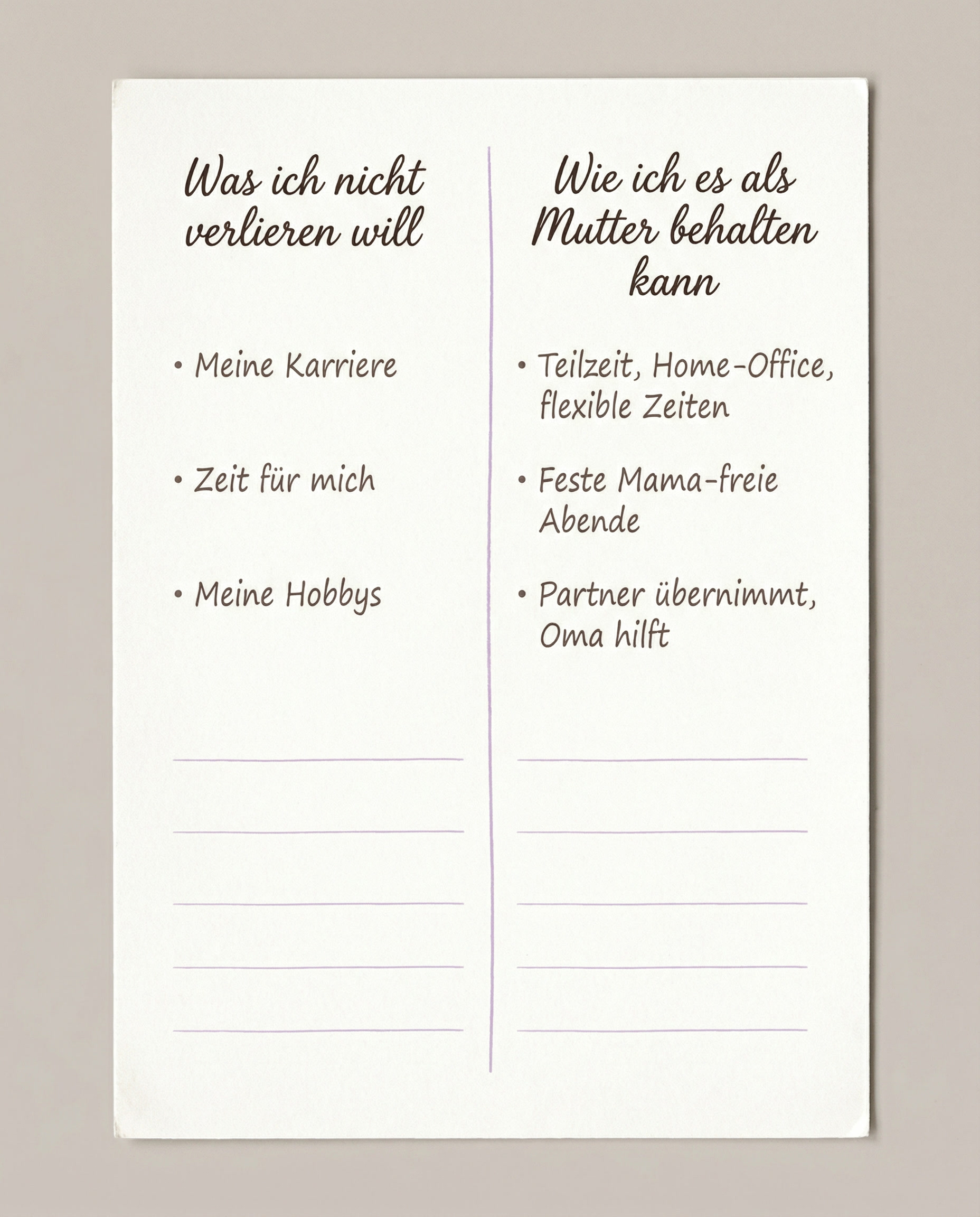Praktische Übung – Zwei-Spalten-Reflexion: Teile ein Blatt in zwei Spalten. Links: „Was ich nicht verlieren will.“ Rechts: „Wie ich es als Mutter behalten kann.“ Zum Beispiel: Links steht „Meine Karriere“, rechts „Teilzeit, flexible Zeiten, Home-Office“. Dieser konkrete Plan gibt deinem Unterbewusstsein Beweise, dass du sicher bist.