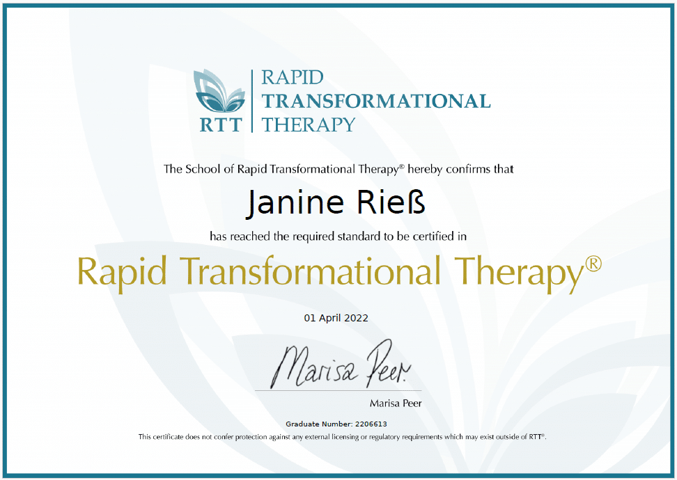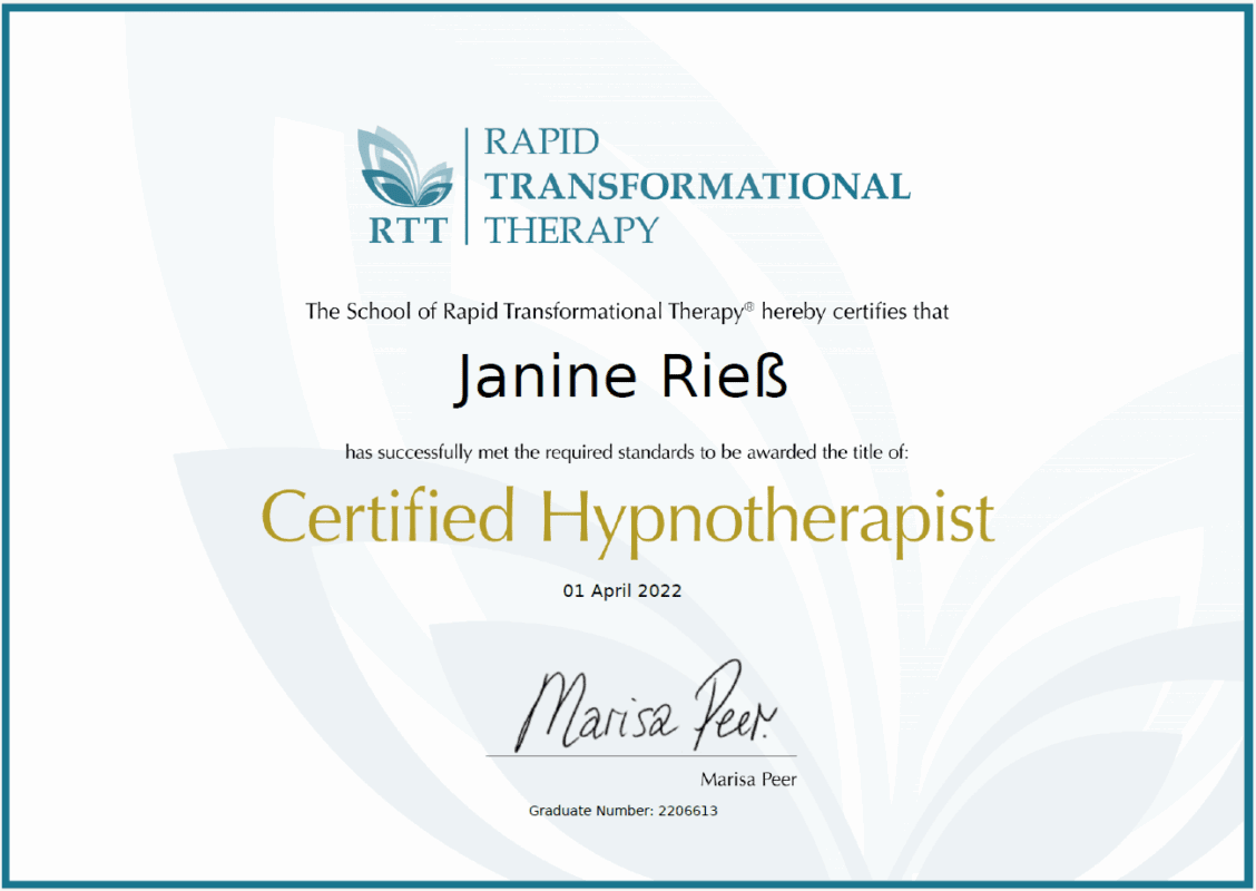 Schon bevor mein eigener Kinderwunsch begann, habe ich mich intensiv für die Psyche des Menschen interessiert – und dafür, wie man sie stärken und positiv beeinflussen kann. Dieses Interesse führte mich zu einer über ein Jahr dauernden, zertifizierten Ausbildung in Rapid Transformational Therapy (RTT) direkt bei Marisa Peer, der Begründerin dieser Methode.